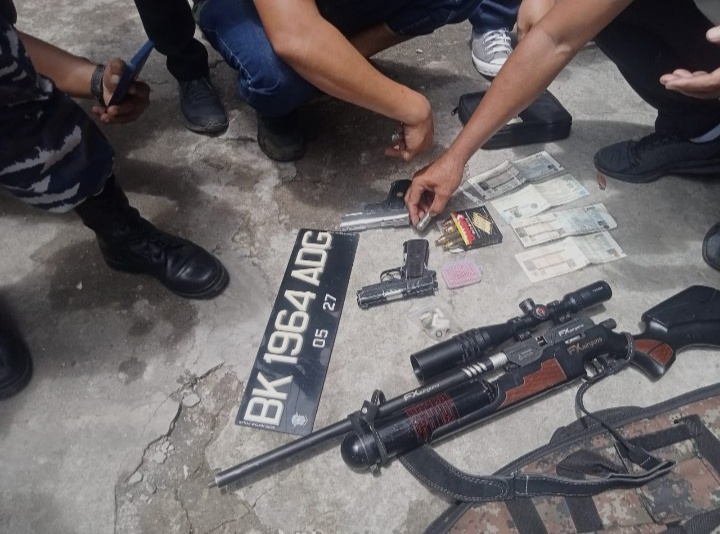 Selain mengamankan keempat orang tersebut petugas gabungan juga menyita sejumlah barang bukti berupa satu pucuk senapan laras panjang jenis Airgun,satu pucuk senjata pistol jenis Airgun,dua pucuk senjata pistol jenis Air Softgun, satu kotak peluru jenis mimis Gotri, Empat set tabung gas untuk senjata laras panjang jenis Airgun,satu paket kecil Narkoba jenis sabu,uang tunai sebanyak Rp. 17.300.000,dan tiga unit kendaraan roda dua (Kereta).