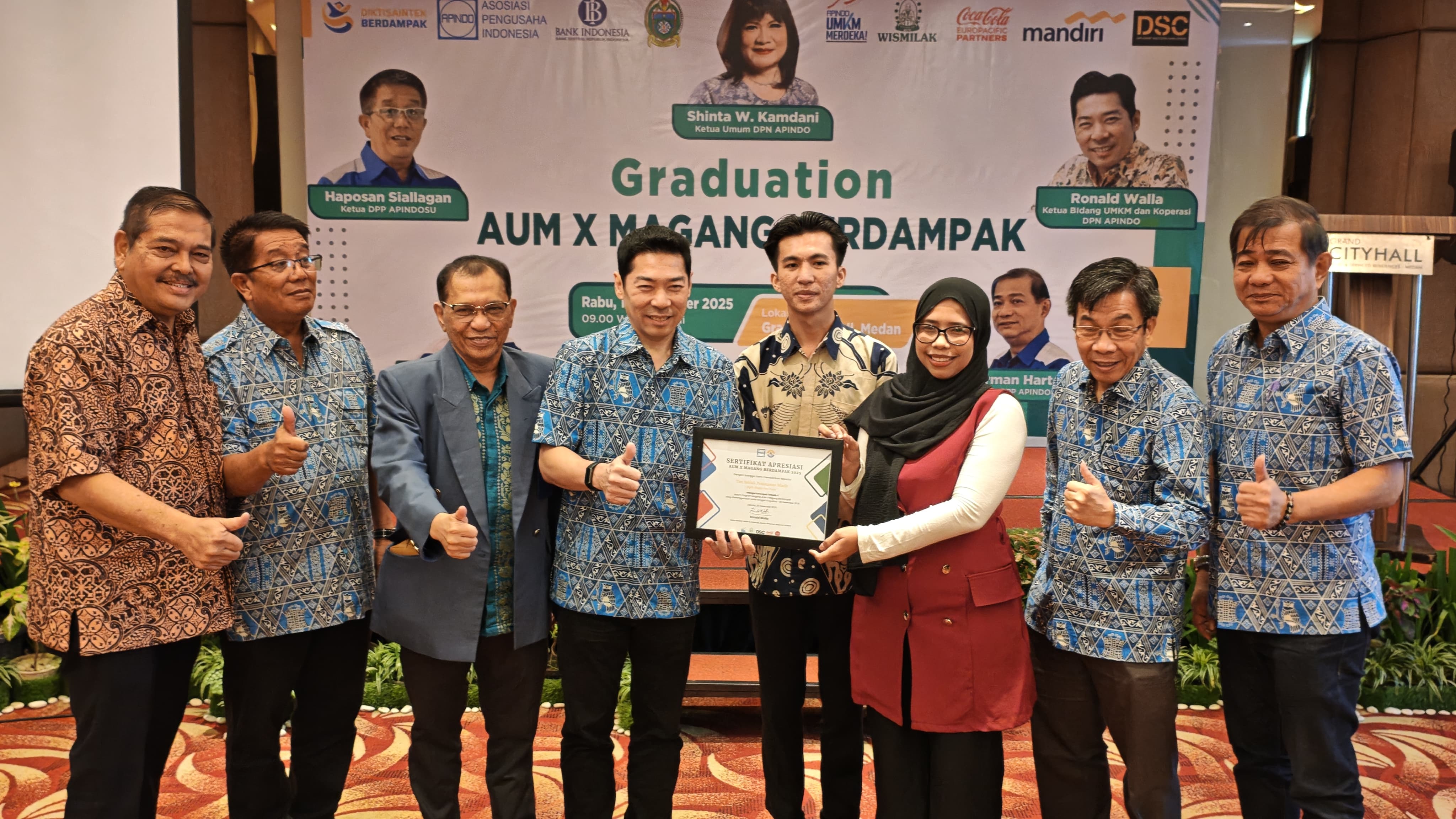 Dewan Pimpinan Pusat (DPP) Asosiasi Pengusaha Indonesia (APINDO) menggelar Graduation UMKM Merdeka (AUM) Magang Berdampak Periode Agustus–Desember 2025 di Grand City Hall Medan, Rabu (10/12/2025).