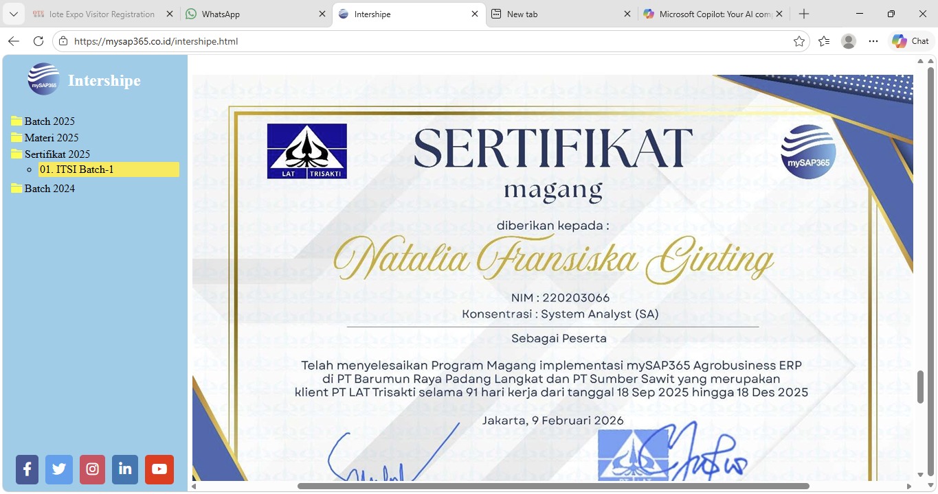 Di samping itu, validasi sertifikat ini juga telah disahkan oleh penyelenggara PT LAT Trisakti, sehingga memperkuat kredibilitas dan nilai profesional bagi seluruh peserta yang telah mengikuti magang mySAP365 DevAgro Foundry AI selama empat bulan.